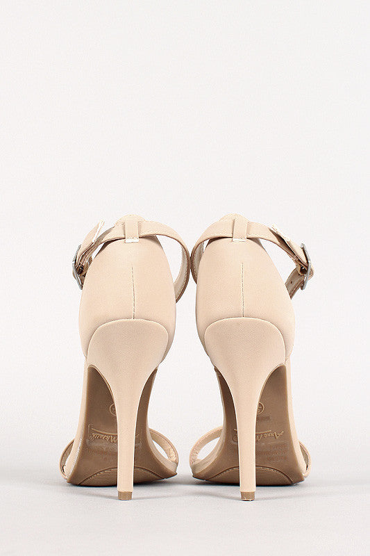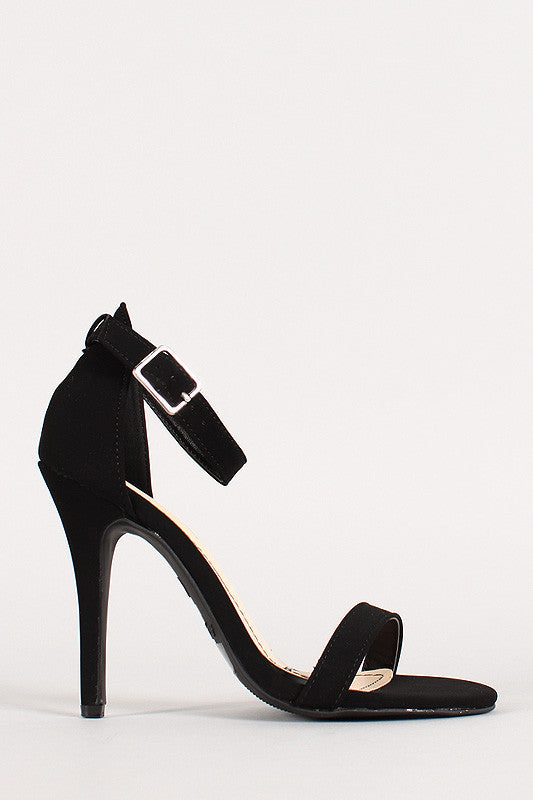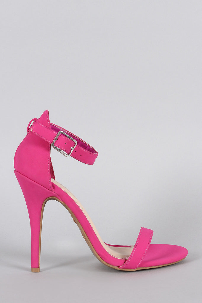 This gorgeous heel features a smooth nubuck upper, an open toe, and adjustable ankle strap buckle closure. Finished with wrapped stiletto heel, stitching detail, and lightly padded insole for comfort.