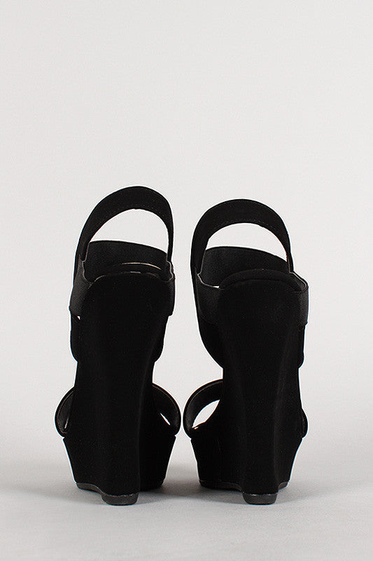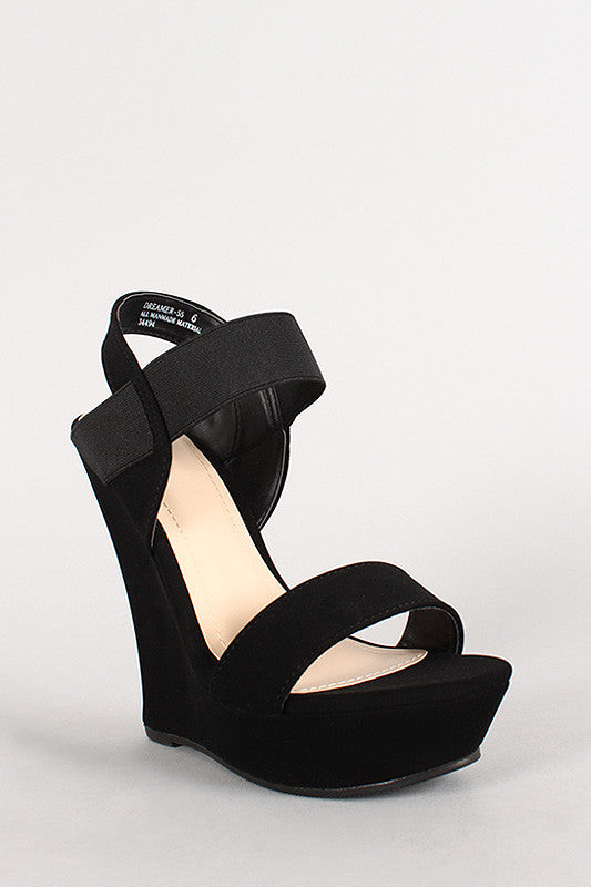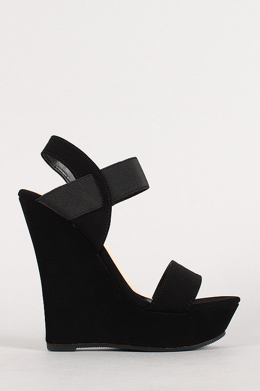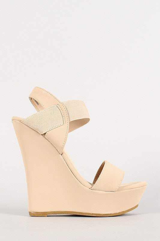 Featuring smooth nubuck upper, open toe, wrapped platform, single vamp strap, elasticized ankle strap, wedge heel, stitching detail, and finished with cushioned insole for comfort.