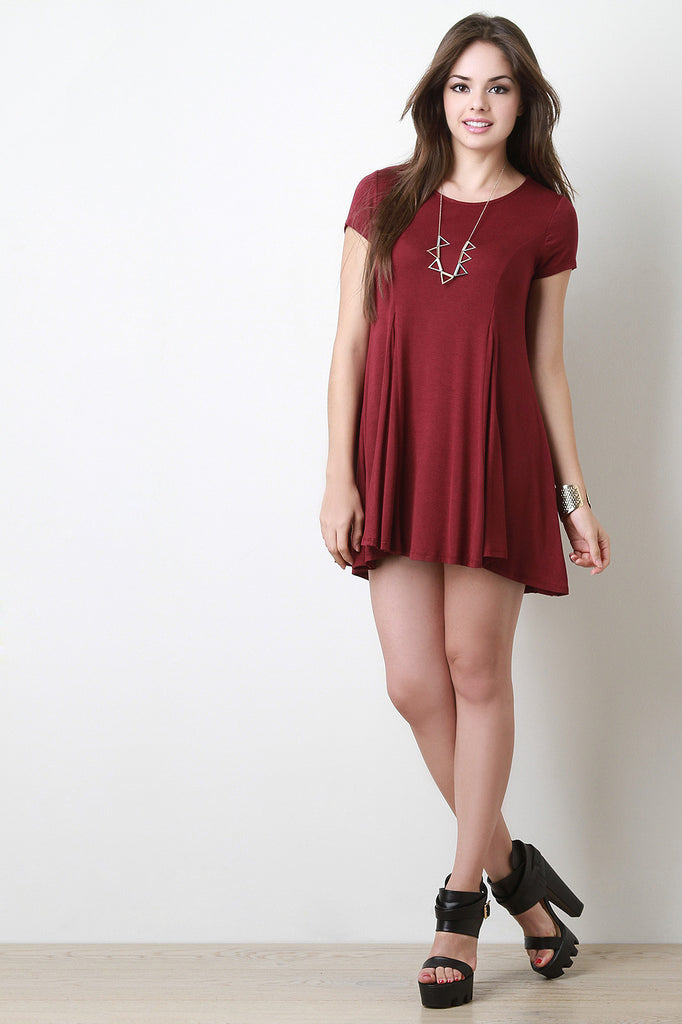 A jersey mini dress featuring a round neckline, short sleeves, and a relaxed shift fit. Finished with a gored skirt design for a flared shape. Accessories sold separately. Made in U.S.A. 95% Rayon, 5% Spandex.