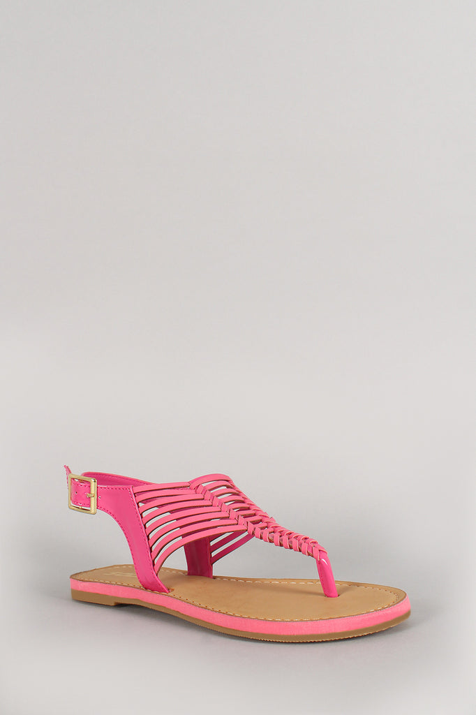 Featuring T-Strap construction at front vamp, thong style, stitching accents, lightly padded insole, and adjustable slingback strap with buckle closure.