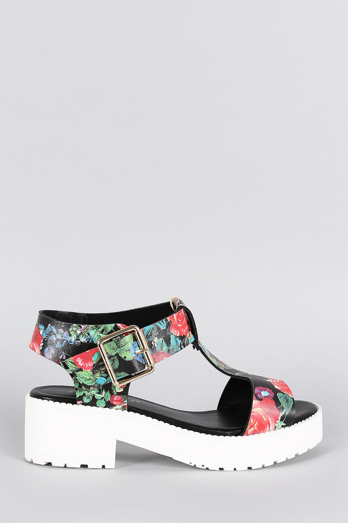 This trendy flatform sandal features a floral print leatherette upper, an open toe, and T-Strap construction. Finished with lightly cushioned insole, block heel, and adjustable ankle strap with side buckle closure.