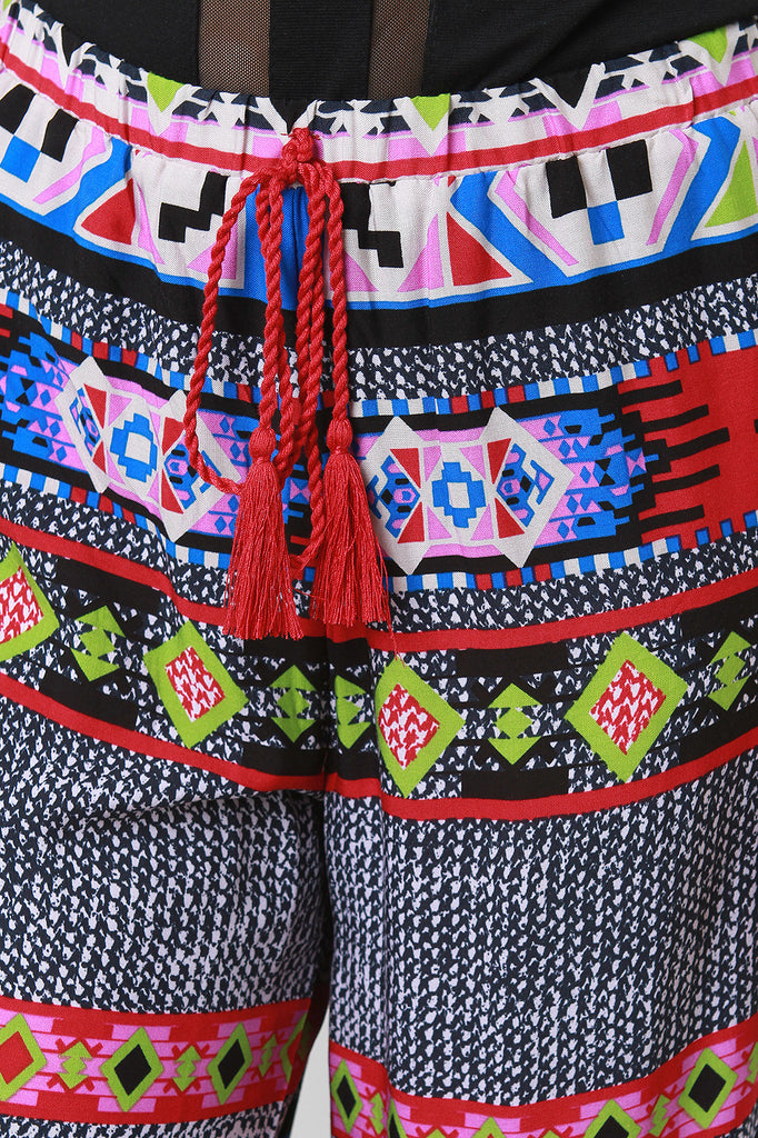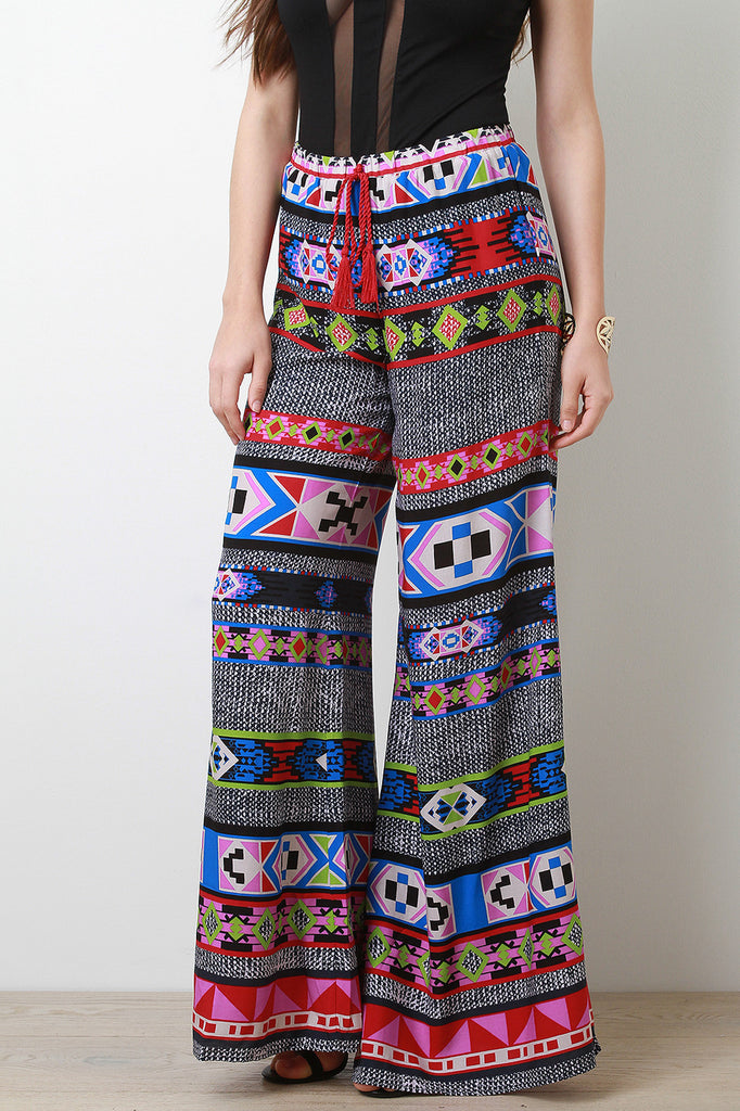 These trendy wide leg palazzo pants features a bohemian pattern print, elasticized waist, and tassels drawstring d�cor. Accessories sold separately. 100% Rayon.