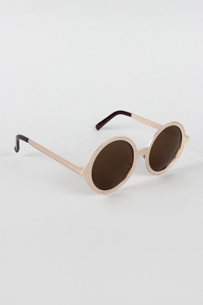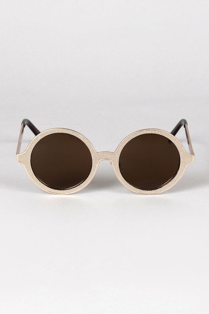 These round-eye sunglasses feature a textured metallic frame and colored reflective lenses.