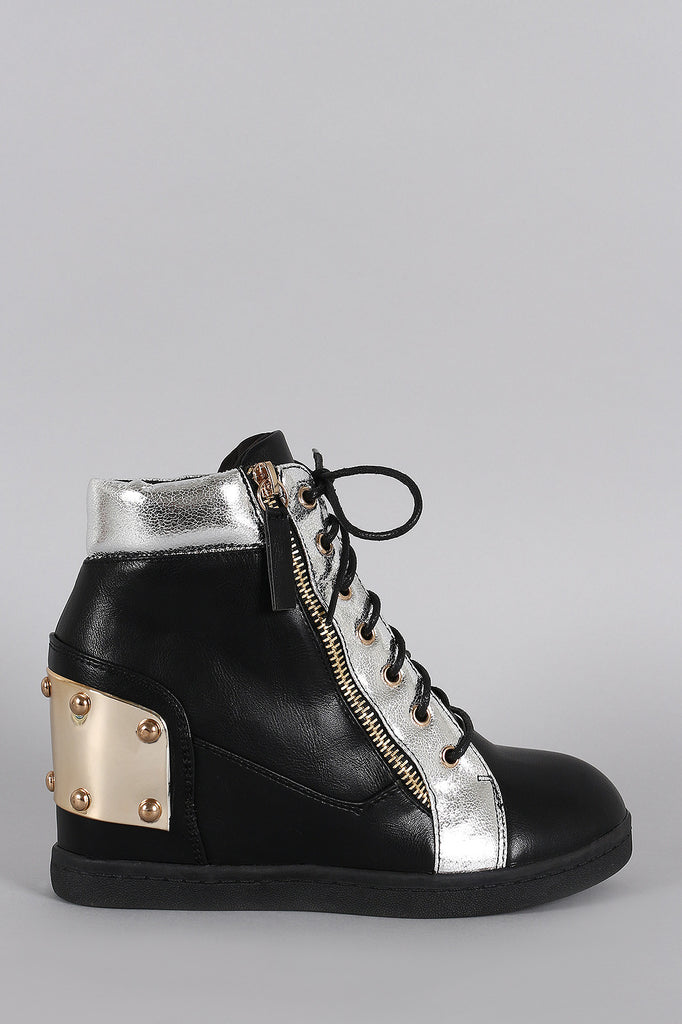 This high top wedge sneaker features a leatherette upper with metallic panels, a round toe silhouette, and gold-tone zipper trim. It also features a metallic shield with studs accent at the back and hidden wedge heel. Finished with cushioned insole, padded collar/tongue, and lace up closure.