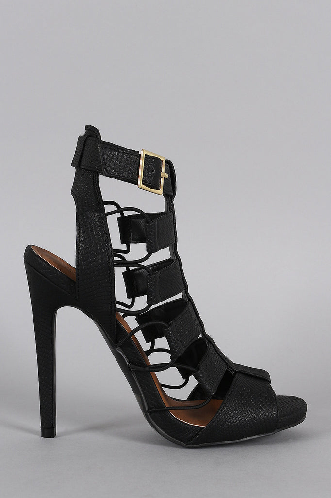 This attractive heel features a snake embossed leatherette upper, caged silhouette, and wrapped stiletto heel. Finished with lightly padded insole and adjustable ankle strap with buckle fastening.