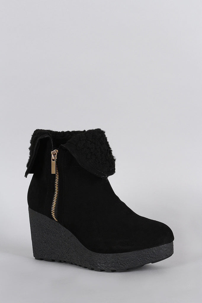 Bamboo Suede Faux Fur Cuff Wedge Bootie