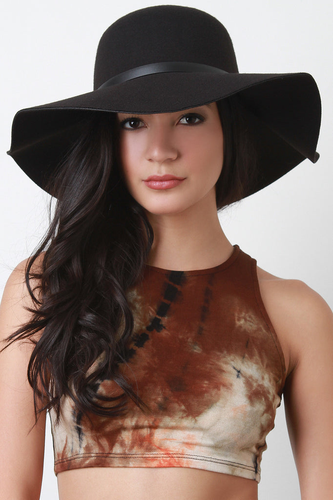 Floppy felt hat featuring a round crown, wide brim, and leatherette strap with bronze buckle embellishment.