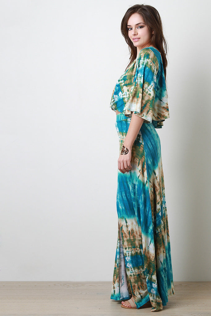 This crop tie dye print throughout, deep V neckline, horizontal back strap, bell sleeves, and finished with flared hemline. Accessories sold separately. Made in U.S.A. 95% Rayon, 5% Spandex.