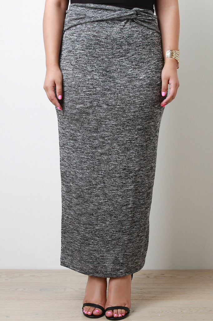 This straight maxi skirt features melange knit material, knotted waist accent, and is unlined. Available in plus sizes . Accessories sold separately. Made in U.S.A. 55% Rayon, 42% Polyester, 3% Spandex.