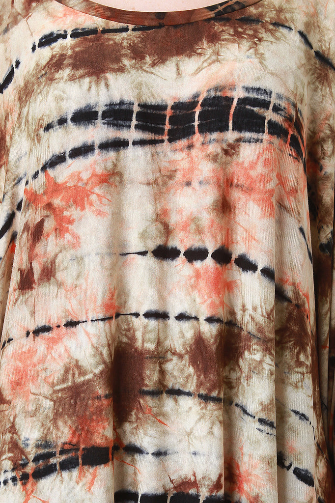 This poncho top features tie dye knit, round neckline, dropped shoulders, and finished with handkerchief hemline. Accessories sold separately. Made in U.S.A. 95% Rayon, 5% Spandex.