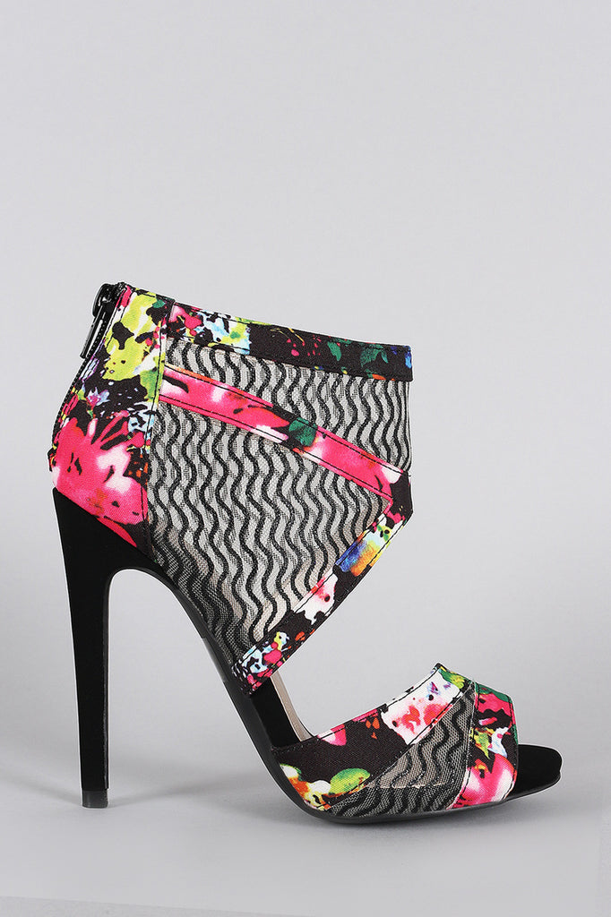 Qupid Floral Wavy Semi-Sheer Mesh Cuff Peep Toe Stiletto Heel