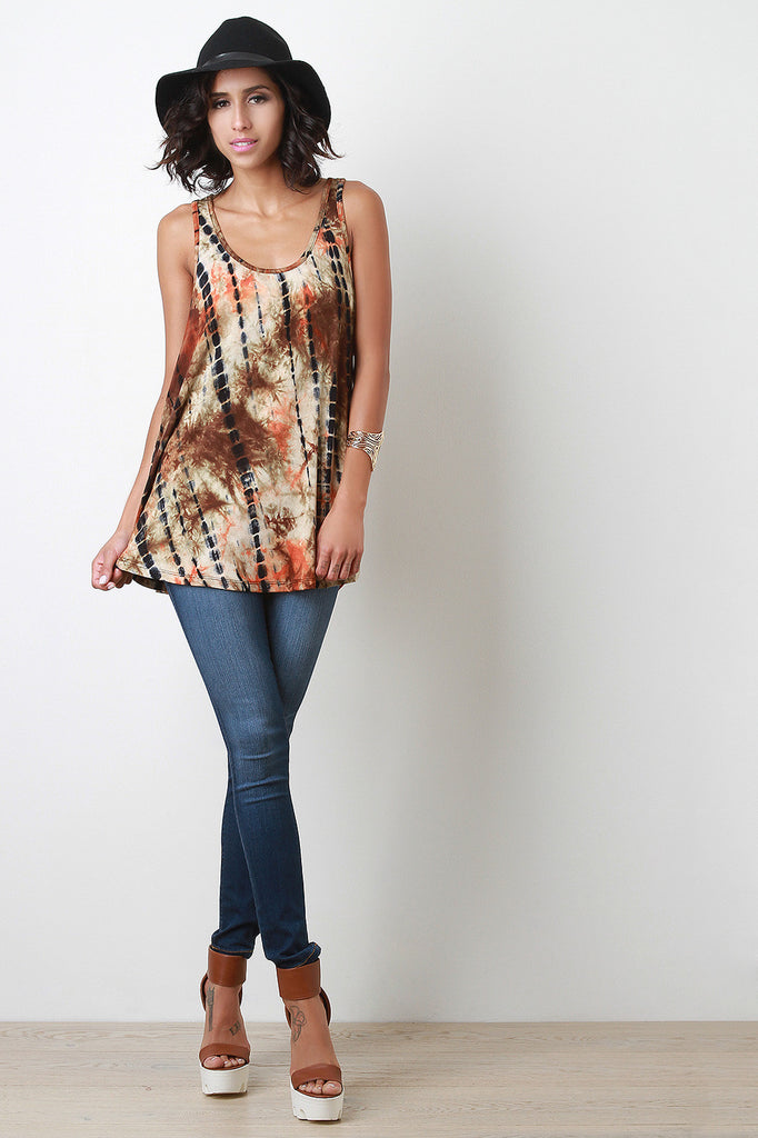 A tie dye print on soft jersey, a scooped round neckline, and racer back. Accessories sold separately. Made in U.S.A. 95% Rayon, 5% Spandex.