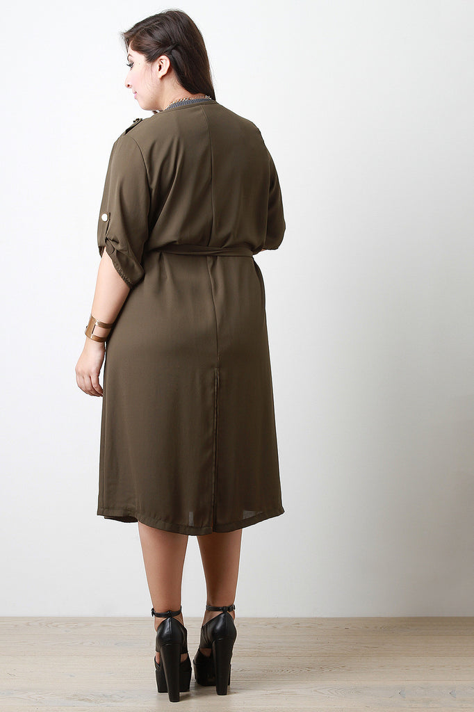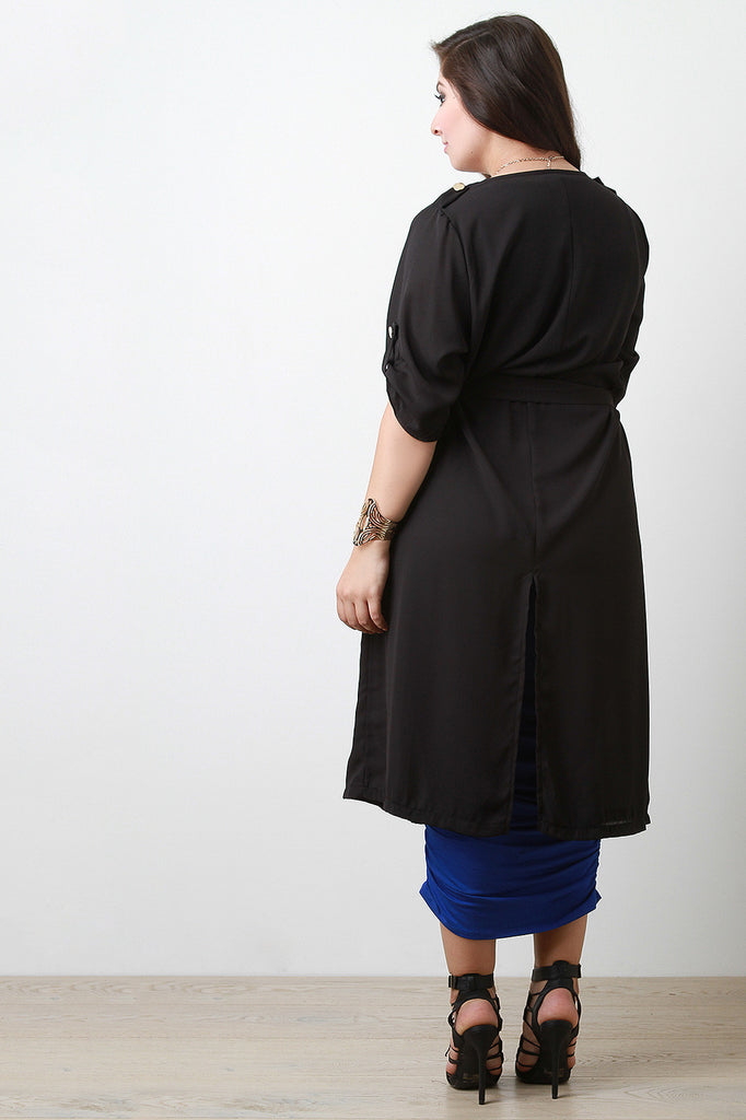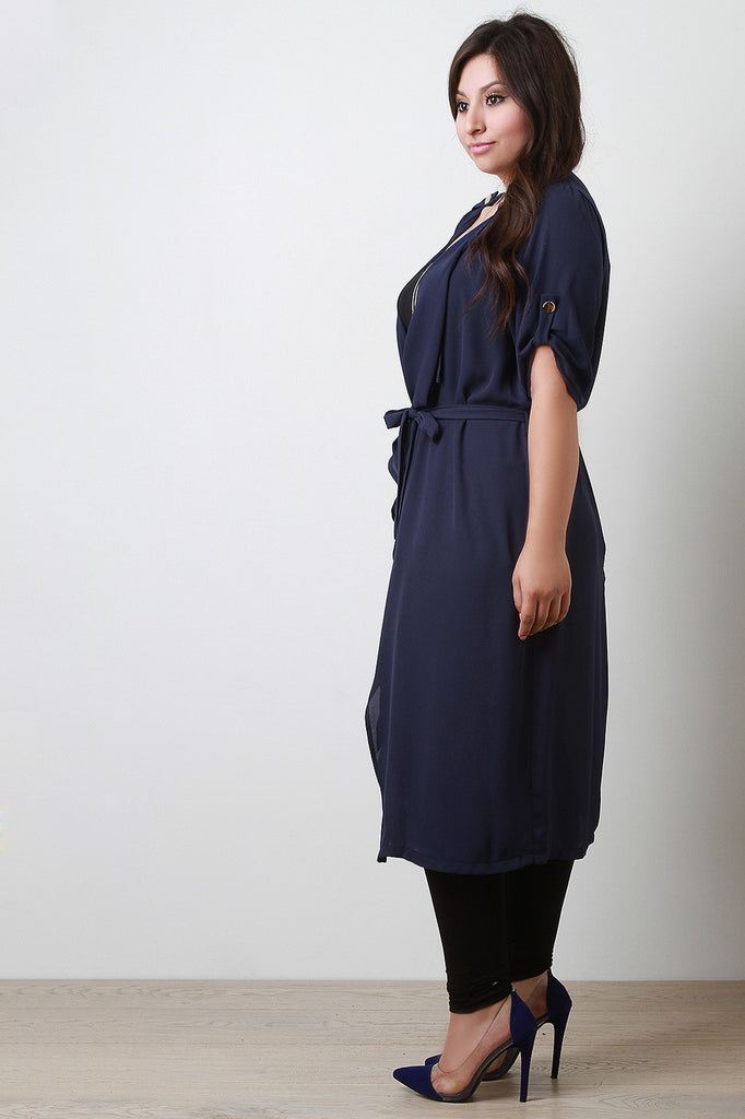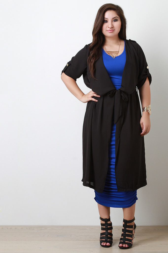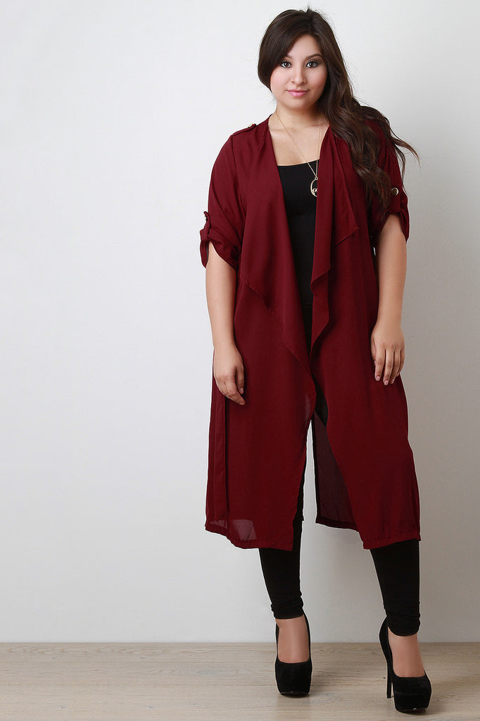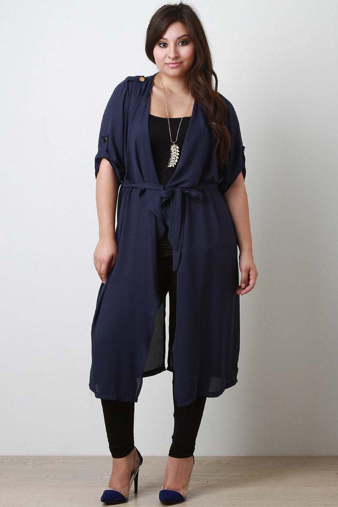 This plus size chiffon long-line trench coat has a shawl draping open front and a self-tie sash. It has quarter sleeves with gold decor buttons. Finished with a back v-slit. Accessories sold separately. 100% Polyester.