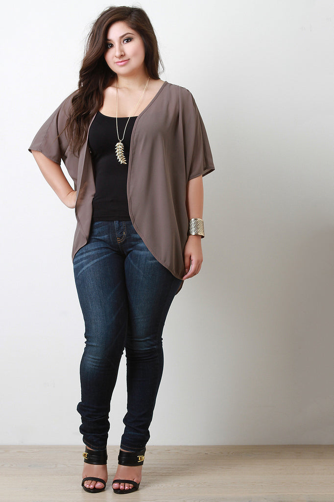 This plus size sheer cardigan has a shawl draping kimono style bodice with an open front. Accessories sold separately. 100% Polyester.