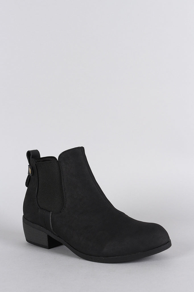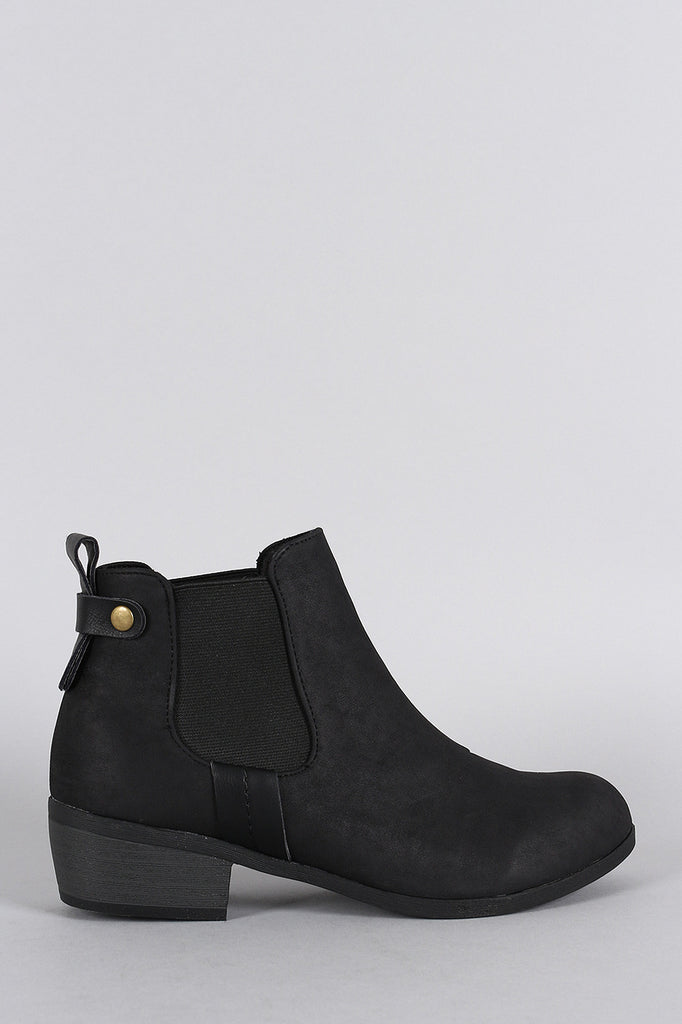 These western inspired ankle boots feature a round toe silhouette, partial elastic at both sides, pull on tab with studded details, and low block heel. Finished with cushioned insole and easy pull on construction.