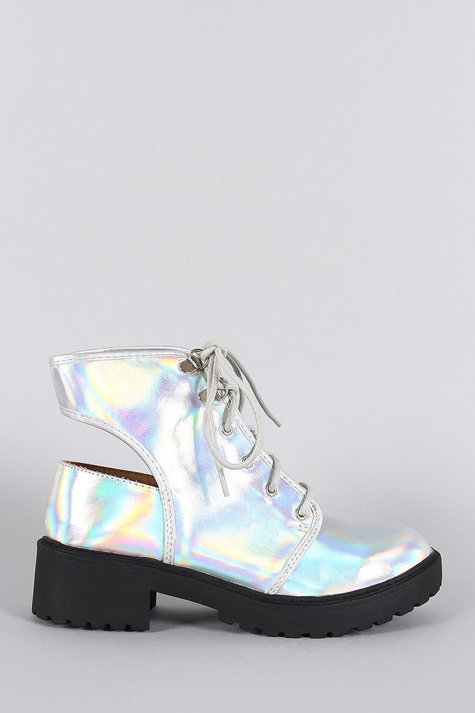 Qupid Hologram Round Toe Lace Up Cutout Booties