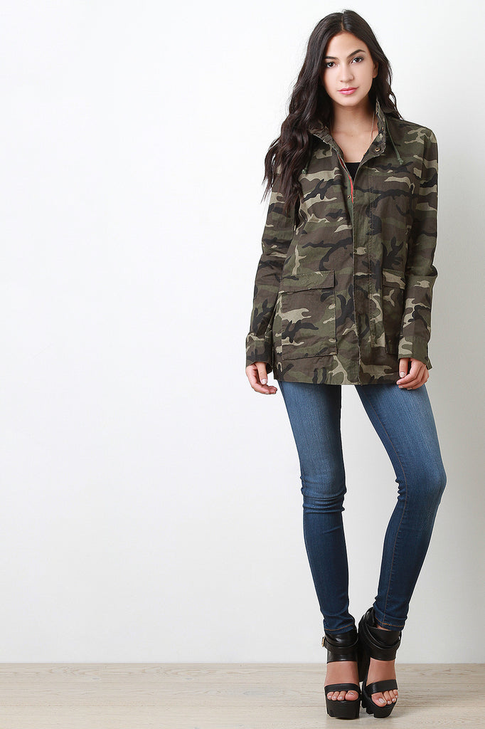 This perfect camo jacket features a hidden zipper fastener with snap button closure, striped hooded back with tuck-away option into stand up collar neckline, long sleeves, square flap pocket, and camouflage print finish. Accessories sold separately. 100% Cotton.