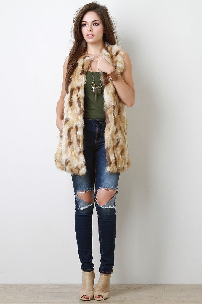 This cozy faux fur spotted pattern in shades of brown, open front, and side pockets. Finished with smooth lining. Accessories sold separately. Self: 70% Acrylic, 30% Polyester. Lining: 100% Polyester.