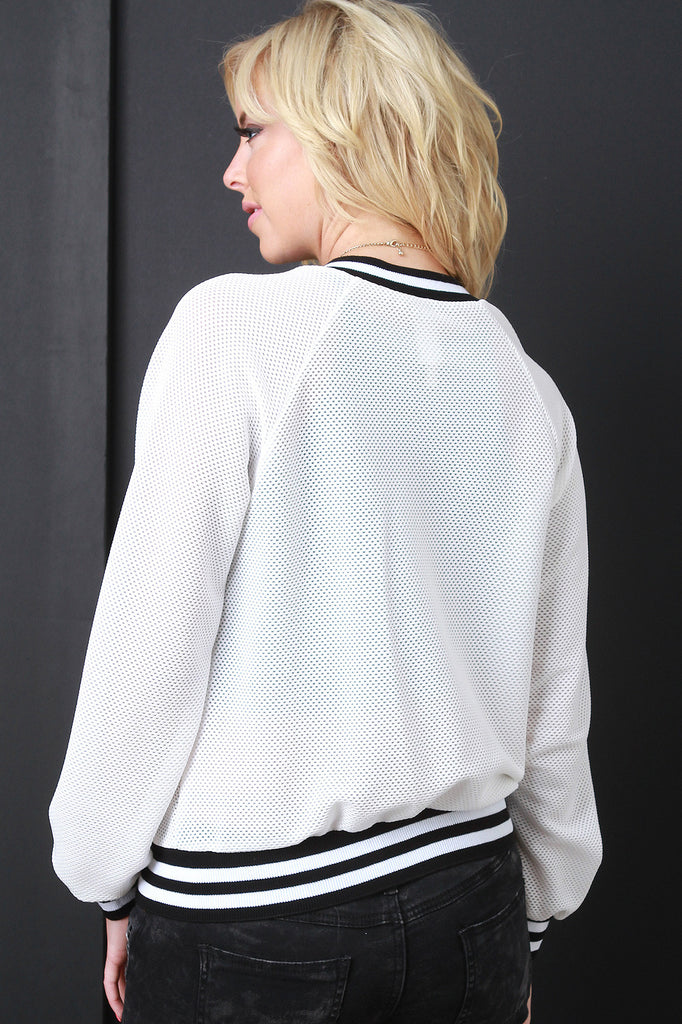 This jacket features a semi-sheer mesh knit fabrication, zipper front, long sleeves with raglan seam construction, and finished with contrasting striped ribbed knit trimming. Accessories sold separately. Made in U.S.A. 96% Polyester, 4% Spandex.