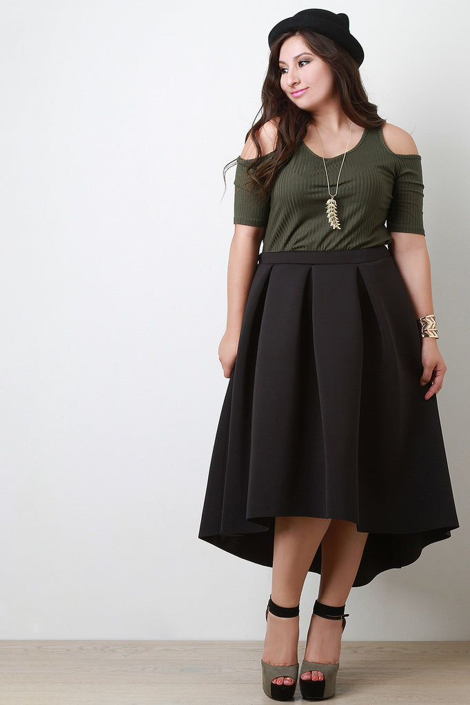 This plus size crop top features a ribbed texture throughout, round neckline, and cutout shoulders design with wide shoulder straps and short sleeves. Accessories sold separately. Made in U.S.A. 96% Rayon, 4% Spandex.