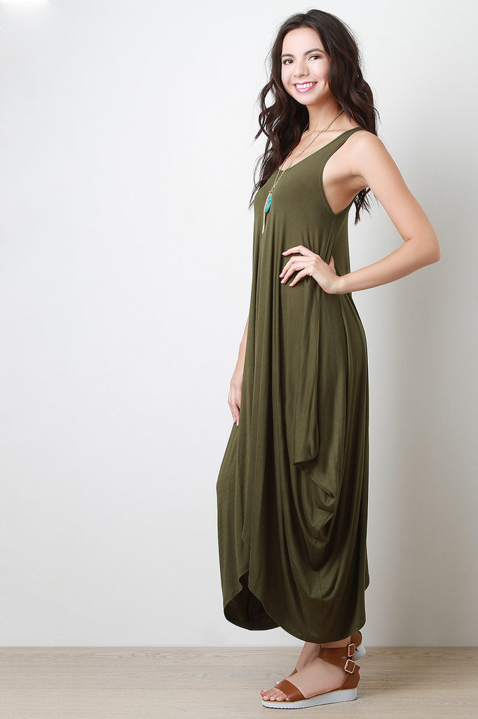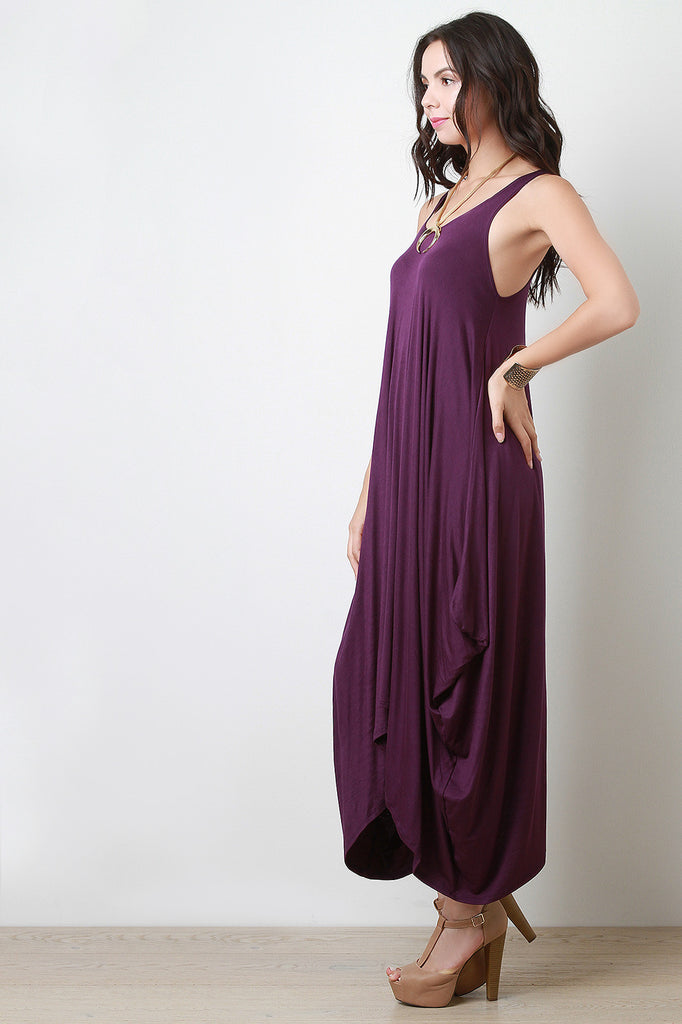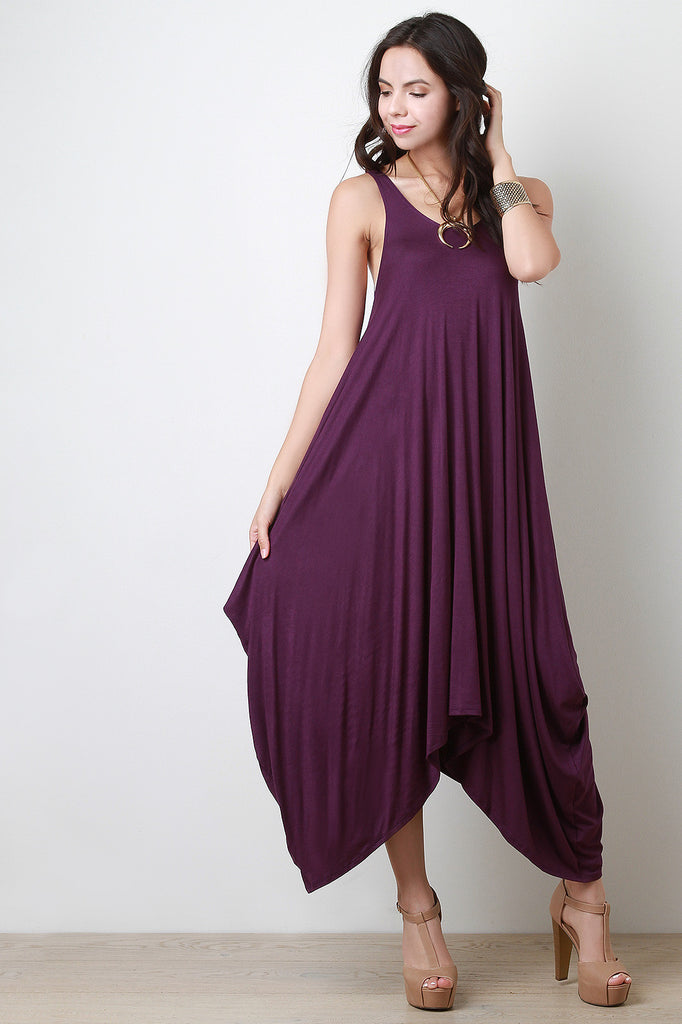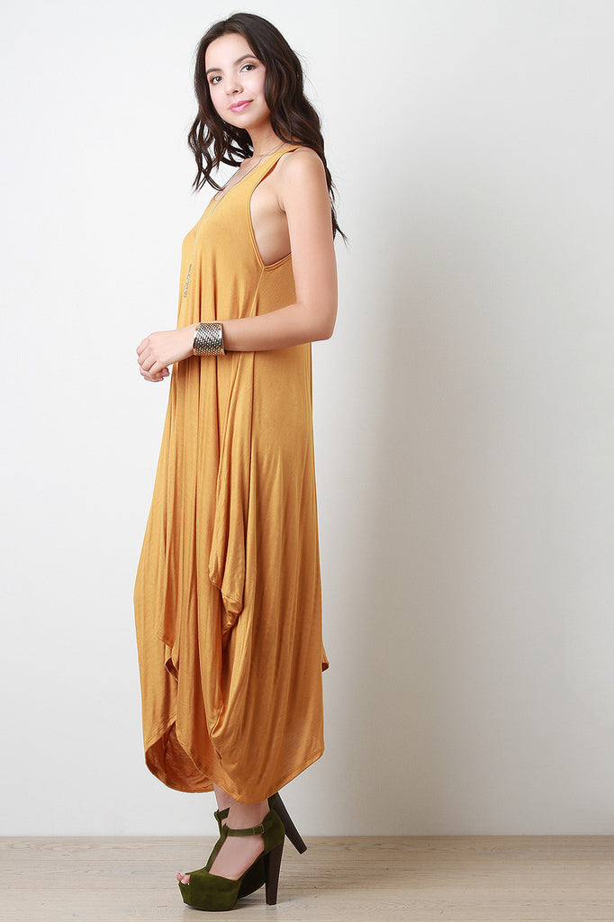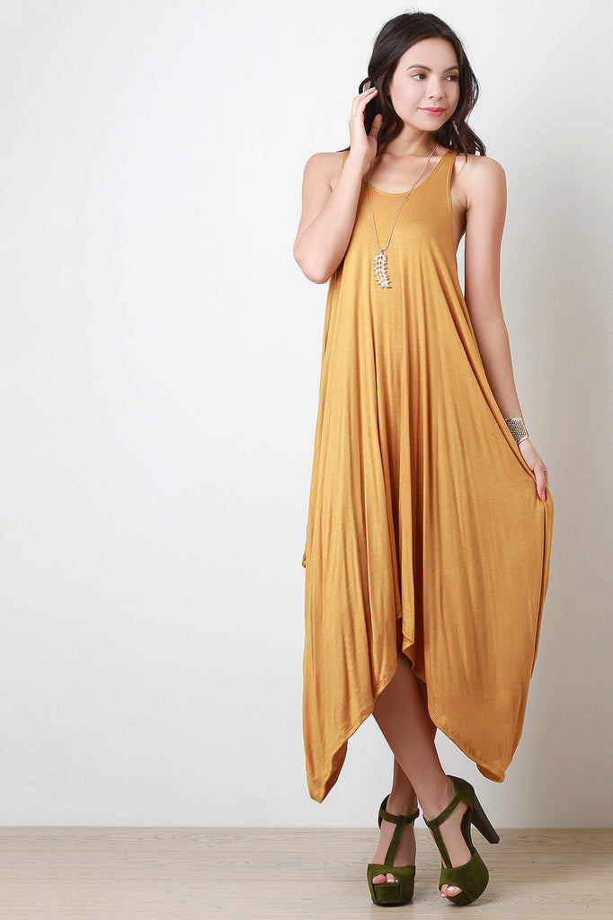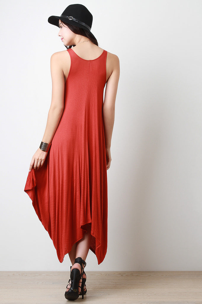 A sleeveless maxi dress with round neckline, draping sides, and handkerchief hemline. Unlined. Accessories sold separately. Made in U.S.A. 95% Rayon, 5% Spandex.