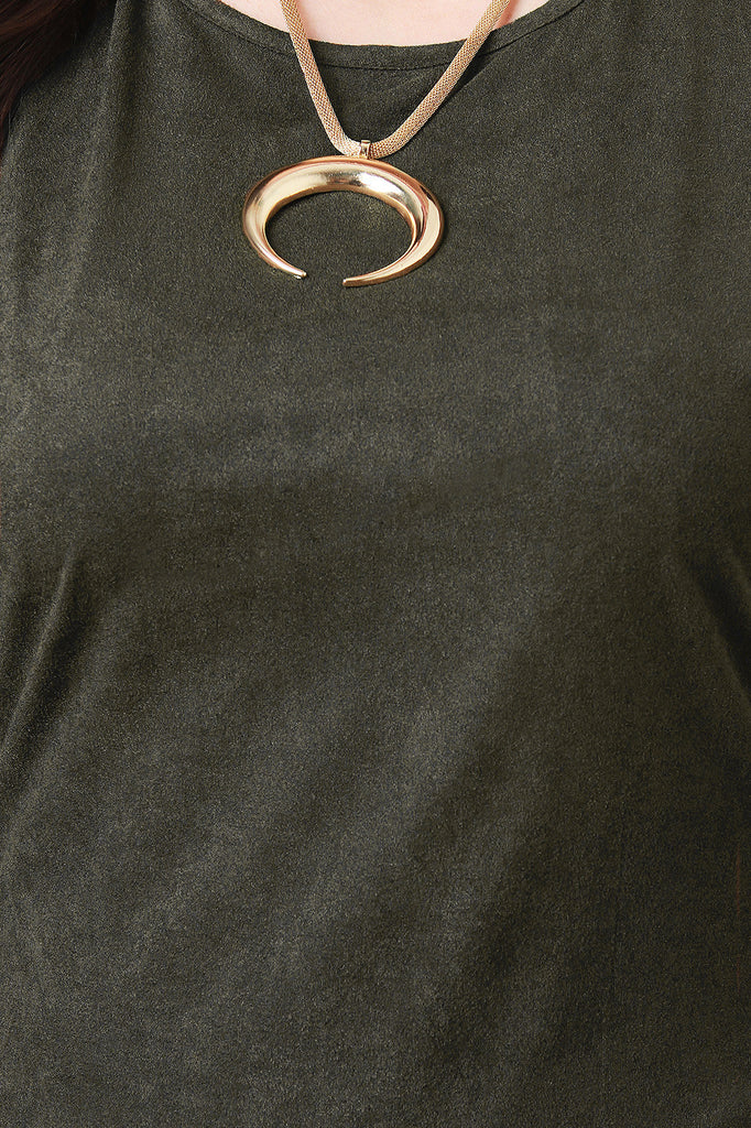 This plus size curve hugging mini dress is tee silhouette and perfect for versatile wear. It is scooped neckline, short sleeves, and curved hemline bodice. Vegan suede structure. Accessories sold separately. 92% Polyester. 8% Spandex.