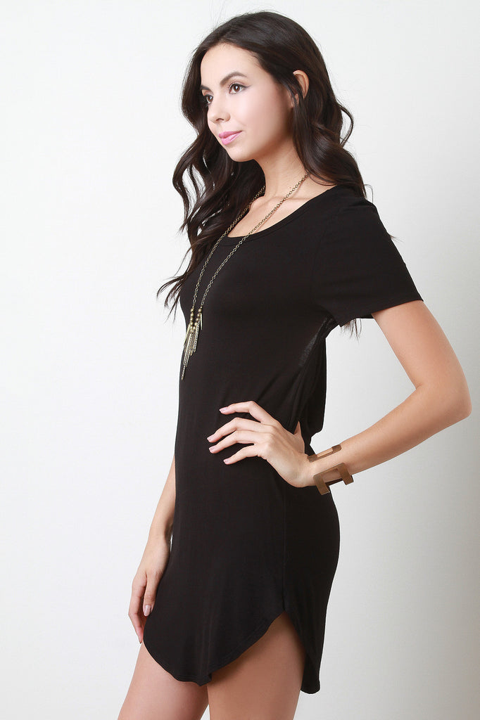 This t-shirt inspire dress features a jersey knit fabrication, round neckline, short sleeves, rounded hemline, and a large cutout back. Accessories sold separately. Made in U.S.A. 95% Rayon, 5% Spandex.