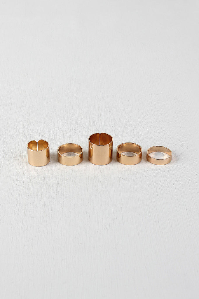 Set of five rings with solid metal bands and varying widths. Non-adjustable.