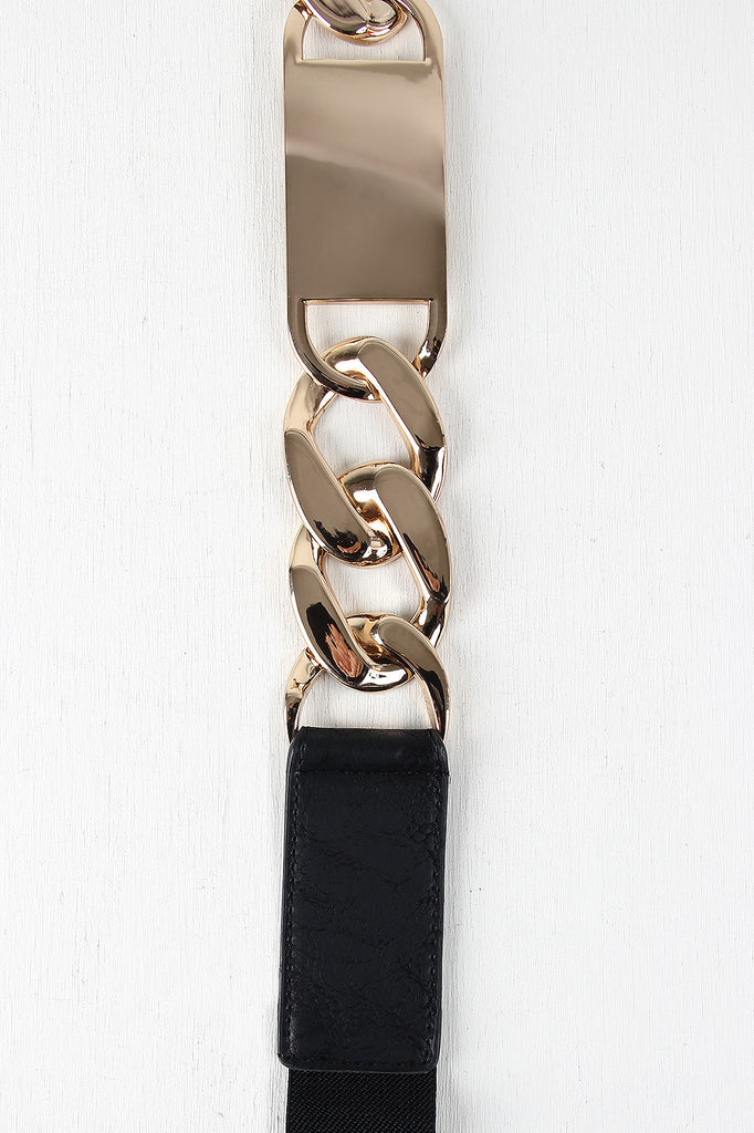 This belt features a glossy metallic plate front, oversized curb link chain, and vegan leather sides. Finished with elastic main and double snap button closure.