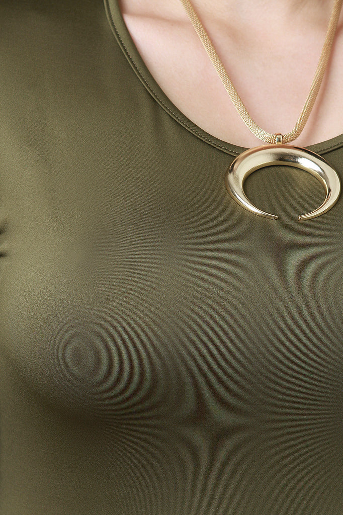 This plus size midi dress features a rounded neckline, quarter sleeves, cutout back with knotted details, and bodycon fit. Accessories sold separately. Made in U.S.A. 92% Polyester, 8% Spandex.
