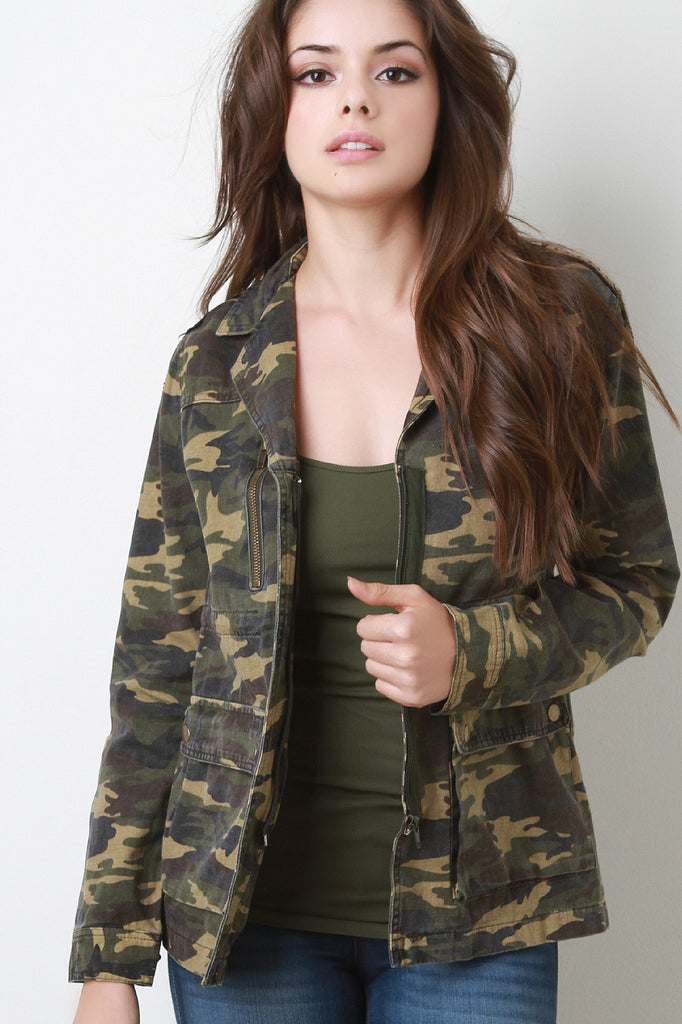 This utility jacket features camouflage print, zip-up front, pointed collar, zipper accent, cone stud accent, stud and chain design shoulders, long sleeves, and two pockets with snap button closure. Accessories sold separately. 100% Cotton.