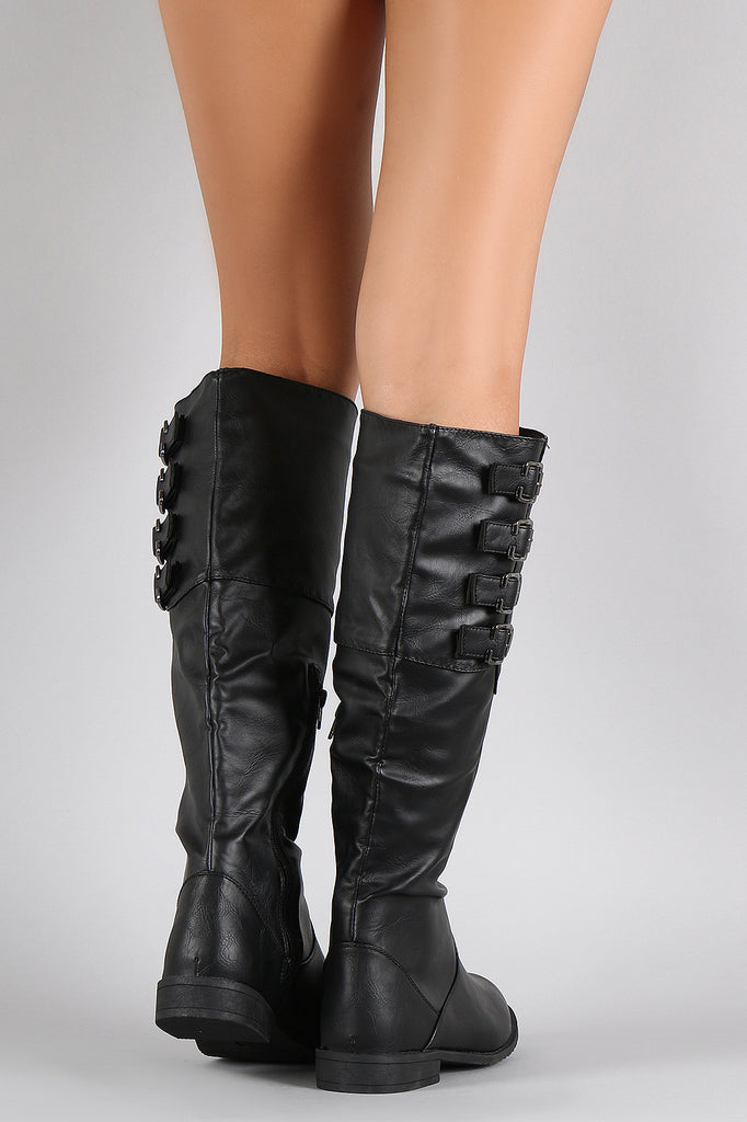 These fashionable boots feature a round toe silhouette, decorative buckles straps detail, top stitching accents, and low block heel. Finished with cushioned insole, soft interior lining, and partial side zipper closure for easy on/off.