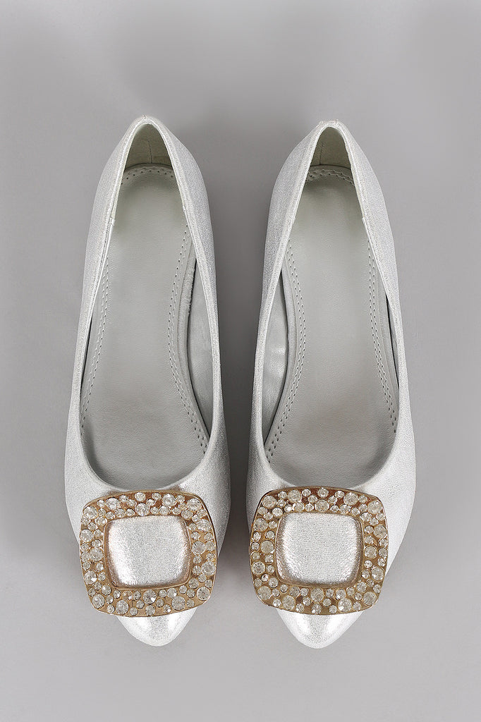This pointy toe slip on silhouette. Designed with an alluring metallic plated square with a cluster of faux jewels.
