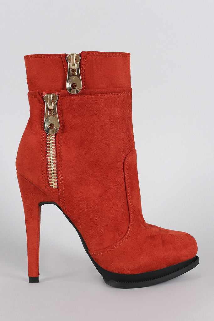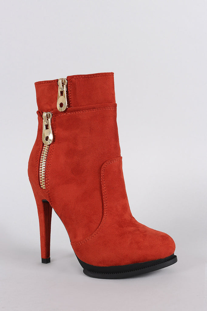 These stunning booties feature a smooth faux suede upper with double zipper trims, almond toe silhouette, low platform, and wrapped heel. Finished with cushioned insole, soft interior lining, and side zipper closure for easy on/off.