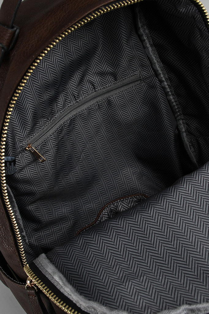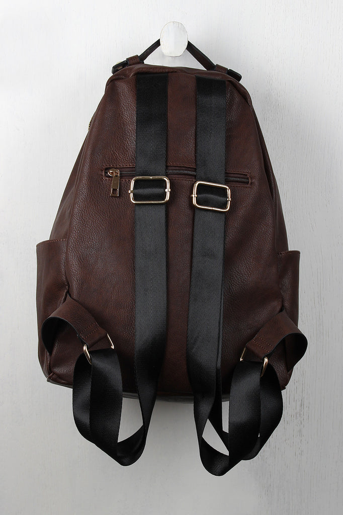 This vegan leather backpack features two front zipper pockets, one main zipper compartment that opens with double leatherette zipper pulls, and a satiny chevron-patterned interior lining with three interior pockets. The exterior features two additional side slip pockets and one hidden zipper pocket at the back. Finished with top handle (1.5" drop), stud embellishments, and glossy gold-tone hardware. The backpack straps are made of thin smooth webbing for easy adjustment.
