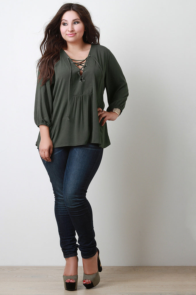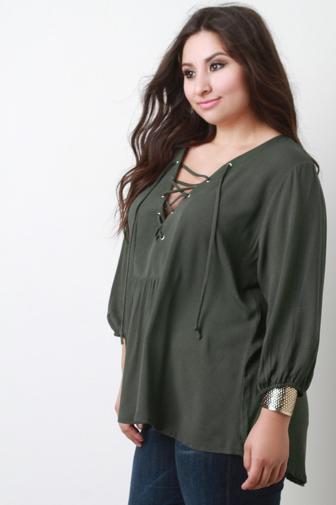 This plus size top is tunic silhouette with three-quarter sleeves and high-low hemline; featuring elasticized armholes. Designed with a plunging v-neckline with lace up straps through grommets. Accessories sold separately. 100% Rayon.