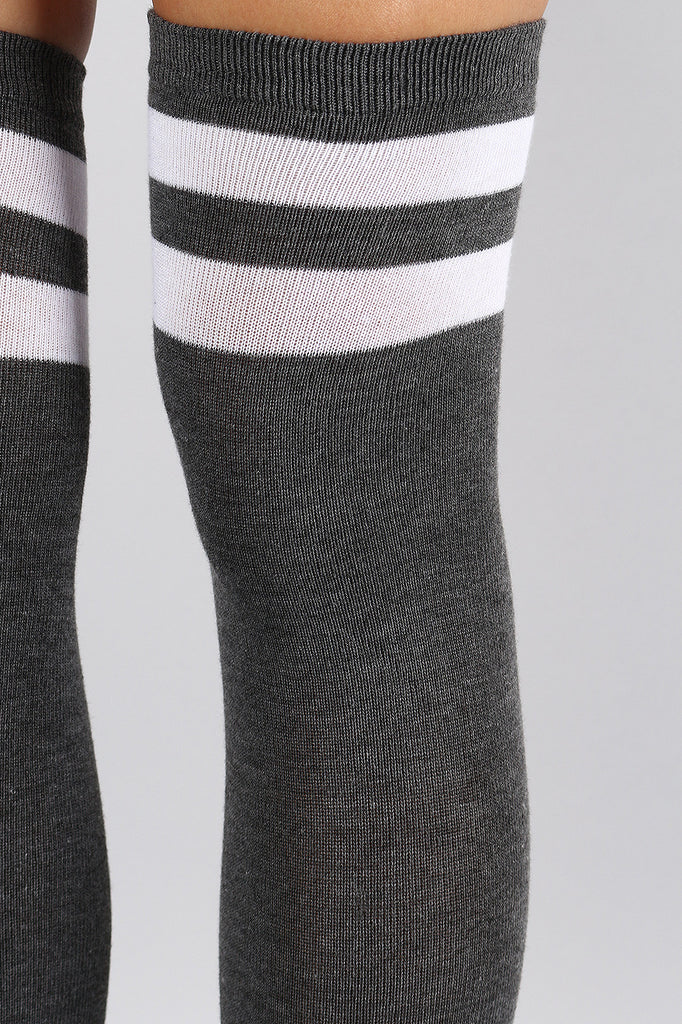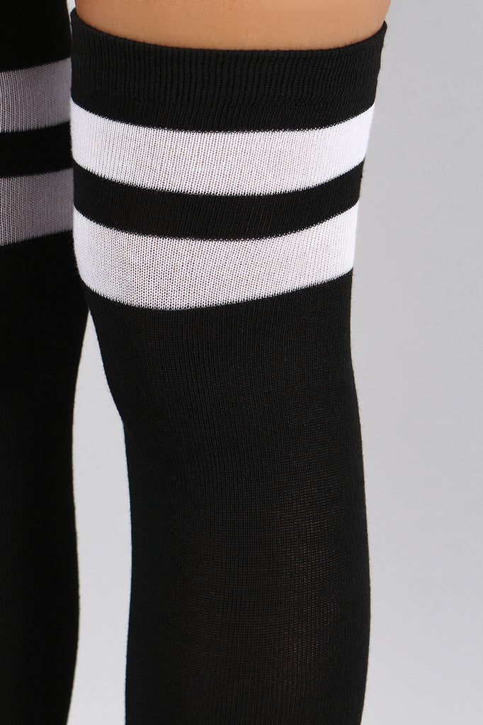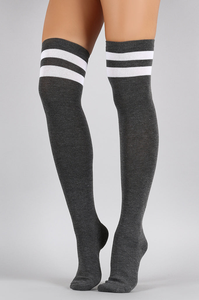 These thigh high stripe accents at the top and ribbed elastic cuffs.