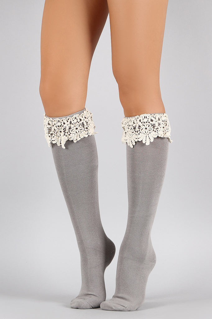 Knee high socks featuring a solid knit construction with floral crochet cuff accent.