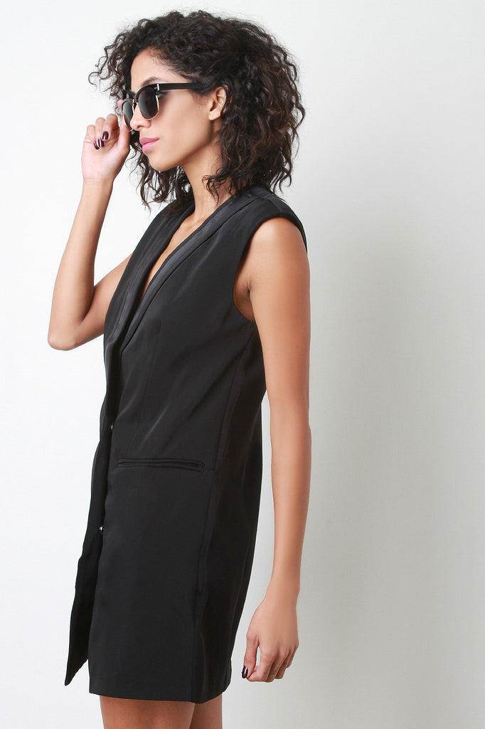A sleeveless mini dress inspired by menswear tuxedo jackets featuring a v-neck collar with glossy webbing center stripe, lightly padded shoulders, and heavyweight construction. Finished with concealed double-breasted snap button closure at front, faux slip pockets, and glossy jacket interior lining. Accessories sold separately. Shell: 94% Polyester, 6% Spandex. Lining: 100% Polyester.