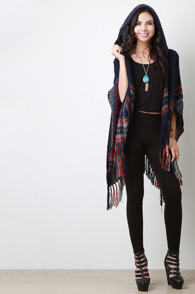 A hooded open front cardigan featuring a soft tufted texture knit, melange stripes design, and fringed handkerchief hemline. Accessories sold separately. 100% Acrylic.