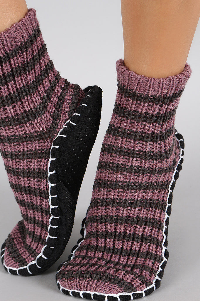 These knit stripe pattern upper, elastic collar, and blanket stitched edge. Finished with slip-resistant dots at the bottom of the sole.