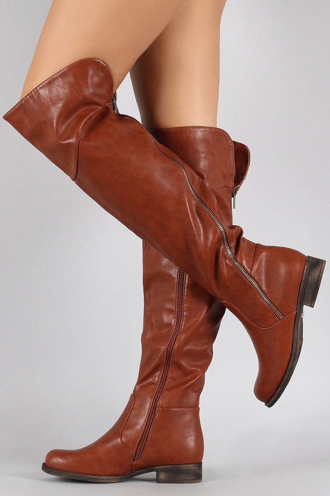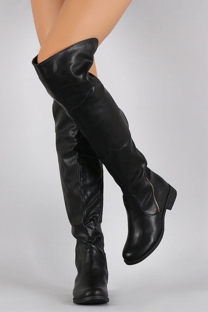 These boots are over-the-knee length, depending on personal height. Designed with a slouchy shaft and a diagonal decor zipper; featuring an inner adjustable side zipper for on-off wear. Finished on a mini heel. Features faux fur lining.