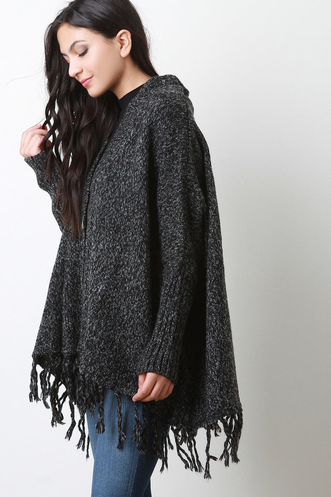 A poncho-style cardigan featuring a melange knit, relaxed boxy shape, and dolman sleeves with fitted ribbed long cuffs. Finished with oversize resin buttons and fringed hem. Accessories sold separately. 20% Wool, 80% Acrylic.