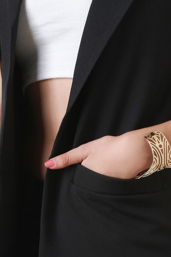 This sleeveless blazer vest features a long line construction, open front, collar neckline, and side vent slits. Accessories sold separately. Made in U.S.A. 96% Polyester, 4% Elastane. Lining: 100% Polyester.