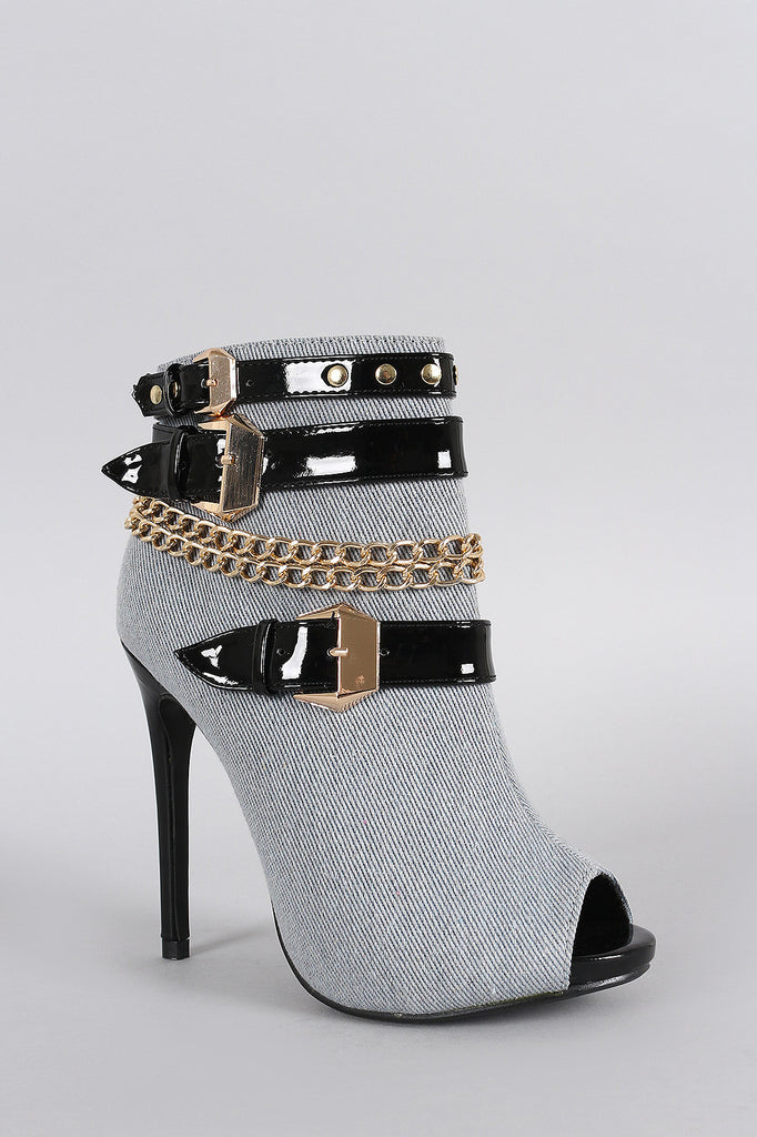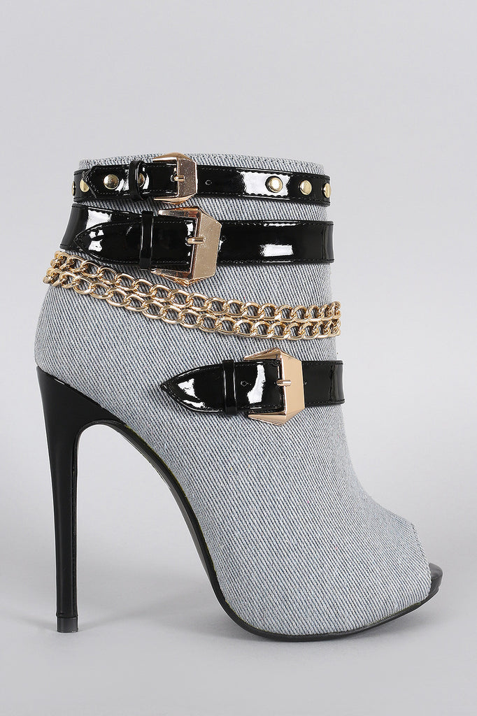Denim Studded Buckled Peep Toe Stiletto Booties