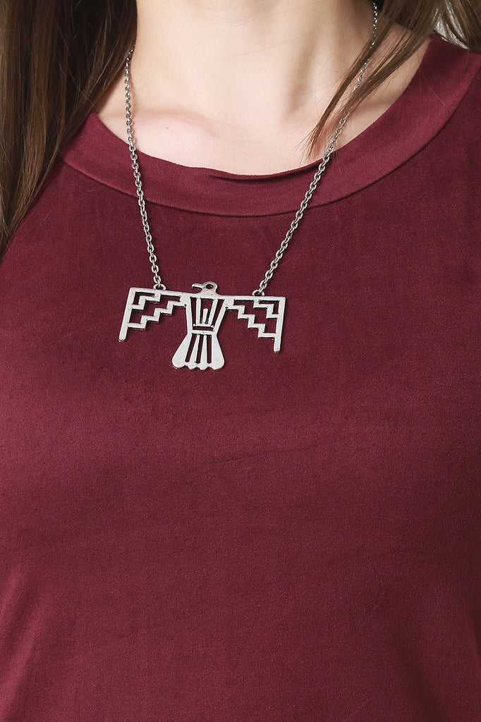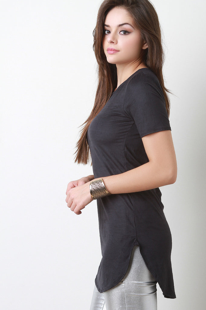 This faux suede , crew neckline, and short sleeves. Finished with a round hemline with side slits. Accessory sold separately. Made in U.S.A. 90% Polyester, 10% Spandex.
