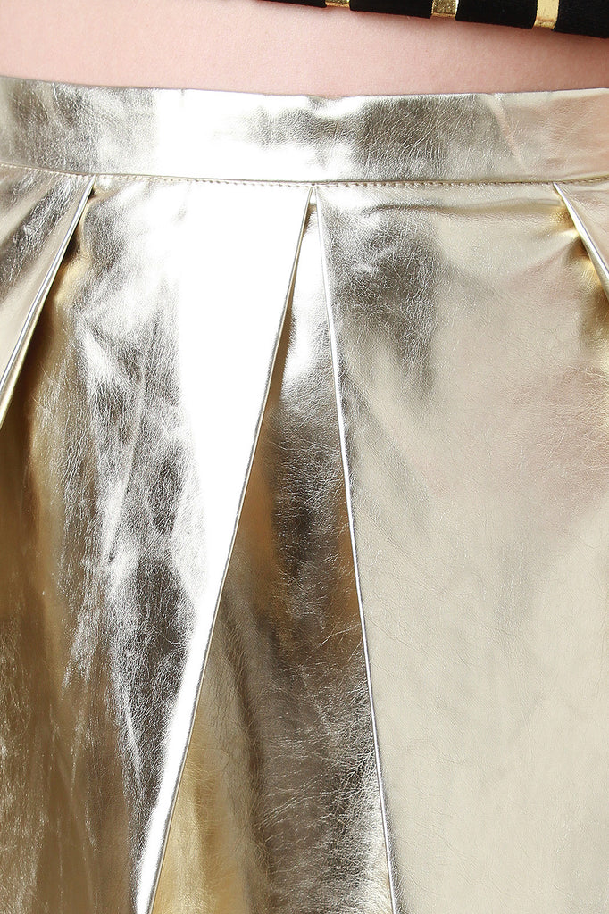 An a-line metallic vegan leather, box pleats, and side pockets. Finished with metallic back zipper closure. Accessories sold separately. 50% Polyester, 40% Polyurethane, 10% Cotton.