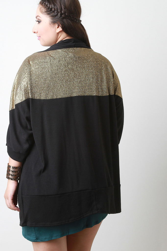 Crinkle Metallic Foil Trim Draped Open Front Cardigan
