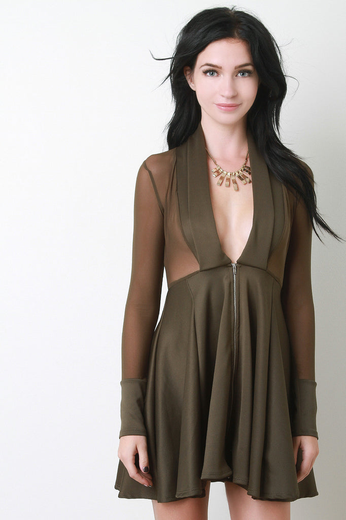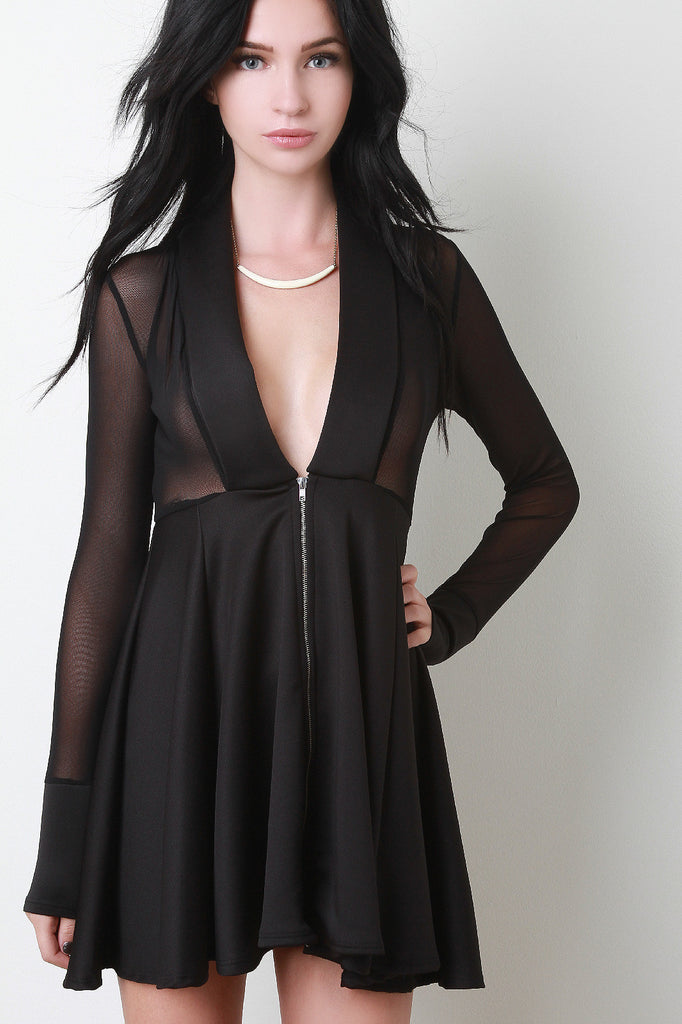 This feminine fit-and-flare dress features a deep-v neckline, shawl collar design, semi-sheer mesh top, long sleeves, and flare skirt with front zip closure. Made in U.S.A. 95% Polyester, 5% Spandex.