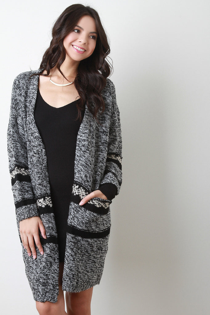 An open front long knit with horizontal ribbing, long sleeves with dropped shoulders, and a stripe pattern at mid-length. Finished with concealed slip pockets at the top of the first stripe. Accessories sold separately. 25% Wool, 75% Acrylic.